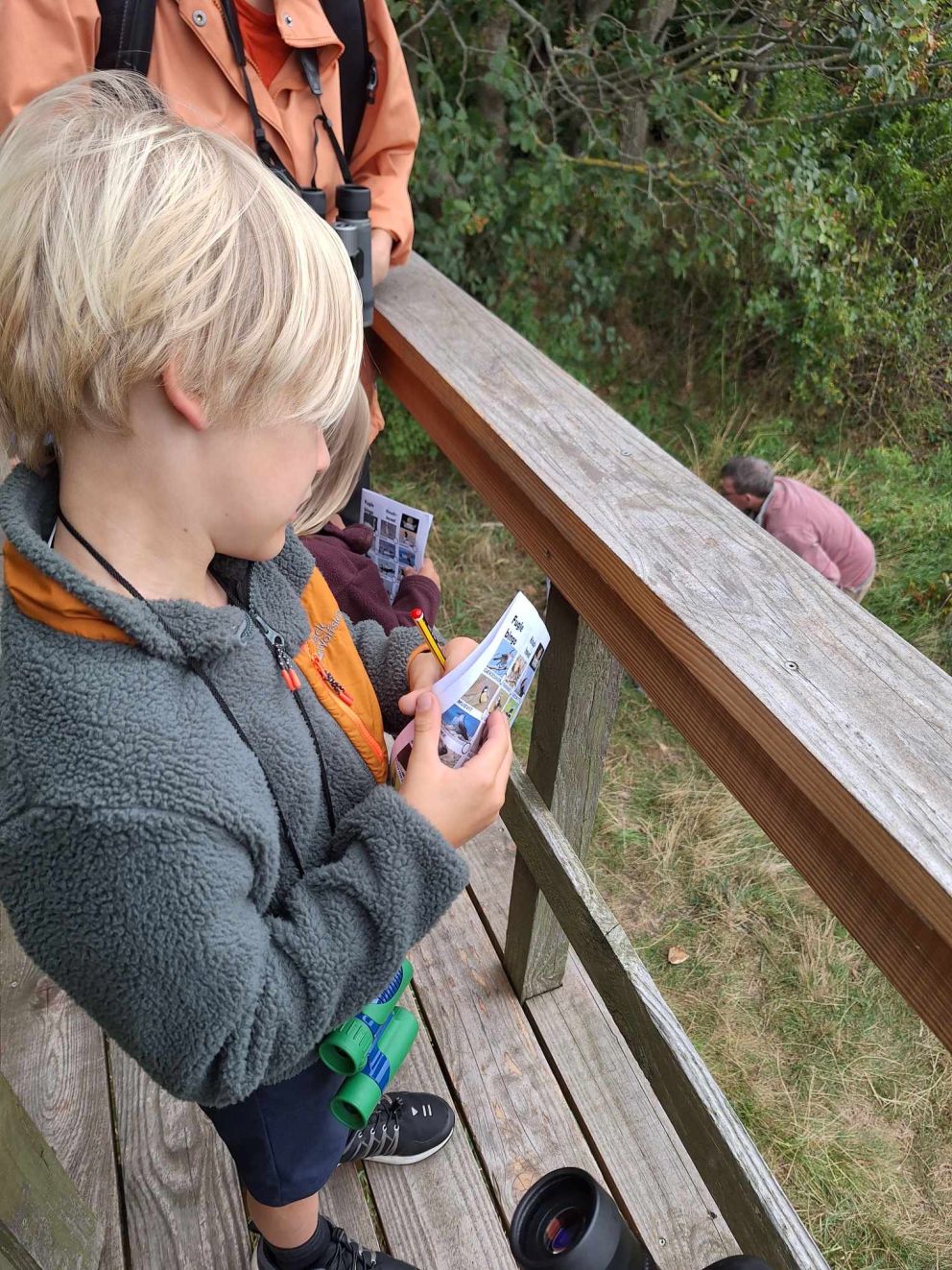 Nu var det tid at besøge fugleskjulet. Det er ikke så stort, så Michael proklamerede, at det kun var for børnene, og at de voksne måtte vente til sidst. Det gjorde nu ikke så meget, for der var også meget at se på, for dem der stod lige neden for tårnet. En herlig udsigt ud over en strandeng, hvor der fouragerede flere af dagens target-arter. I tårnet var der heldigvis en lille taburet, så alle havde en chance for at komme til at se fugl i teleskopet. Foto: Michael Bjerregaard.