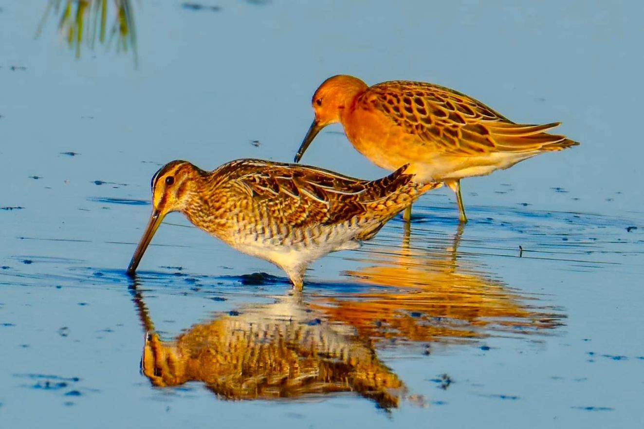Under trækket af vadefugle, raster mange af dem i vådområder. Her Tinksmed og Hvidklire i Bøjden Nor. Foto Esben Aagaard.