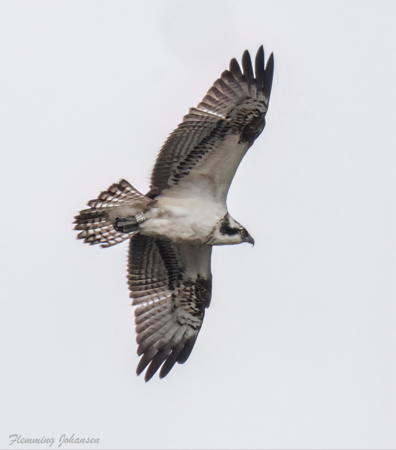 Ringmærket Fiskeørn ved Brændegård Sø. Der er allerede kommet data retur på ringen, og det viser sig, at den er ringmærket i Norge. Foto Flemming Johansen.