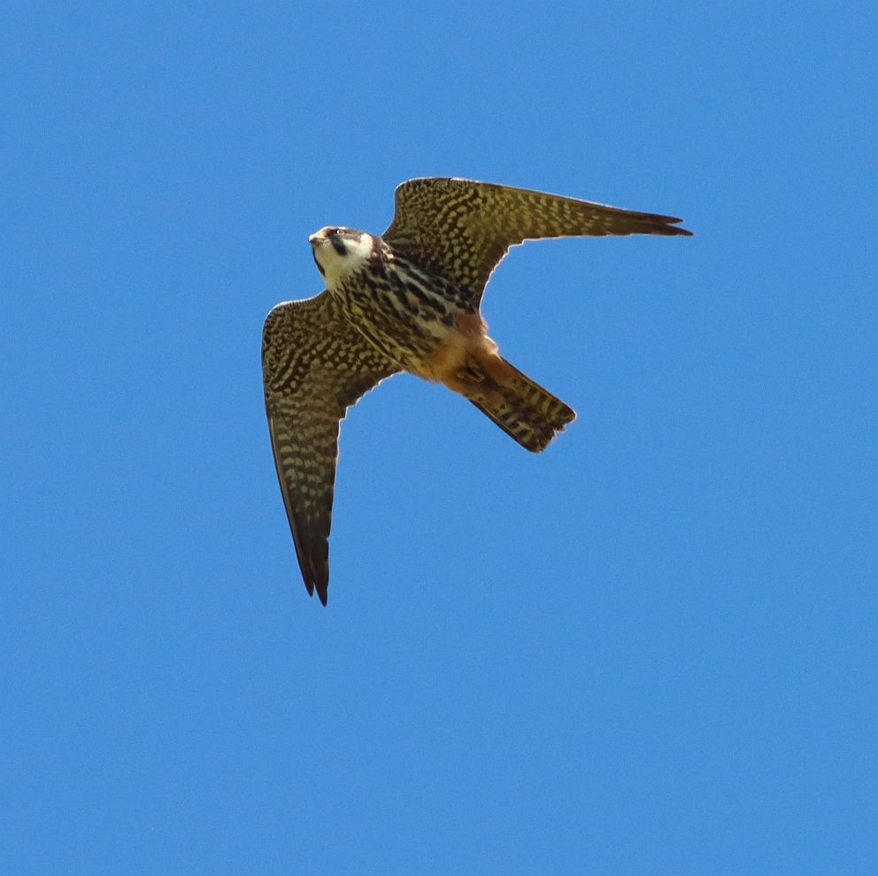 En af seks Lærkefalke ved Arreskov S, torsdag, i gang med en guldsmed. Foto: Leif Kristensen.
