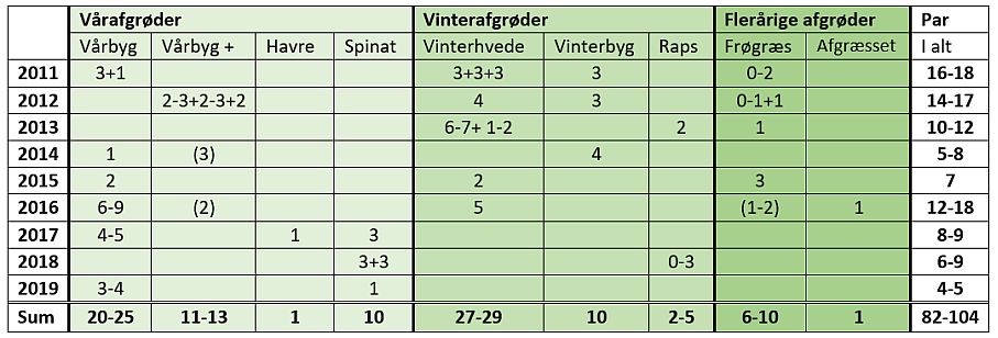 Oversigt over antallet af ynglepar i afgrøderne over de 9 år, jeg har fulgt Viberne i mit sydfynske undersøgelsesfelt på 1250 ha. Vårbyg + dækker over udlæg af frøgræs, det være sig hundegræs, rød svingel, engrapgræs, strandsvingel eller rajgræs, som er de frøgræsser, der gennem årene har været dyrket her. I de seneste tre år ligger tyngden nu blandt yngleparrene i de forårssåede afgrøder.